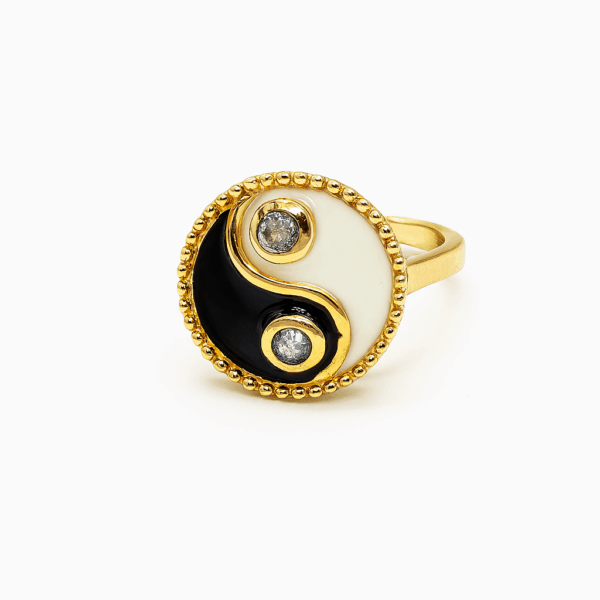 The smooth enamel creates a striking contrast that highlights the iconic Yin and Yang motif—representing harmony, duality, and unity. At the center sits a natural labradorite stone, shimmering with flashes of blue, green, and gold, adding depth and a touch of mystique. Lightweight yet durable, this ring is perfect for everyday wear or elevating special looks