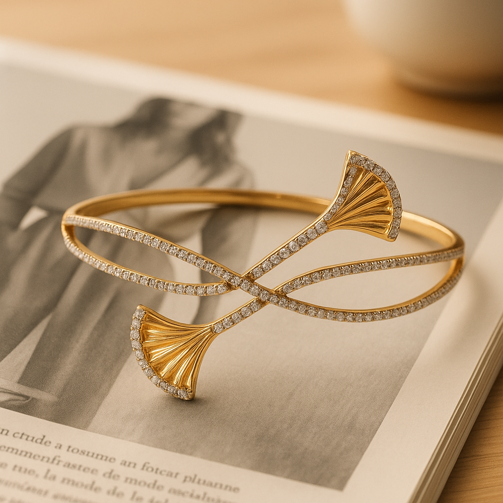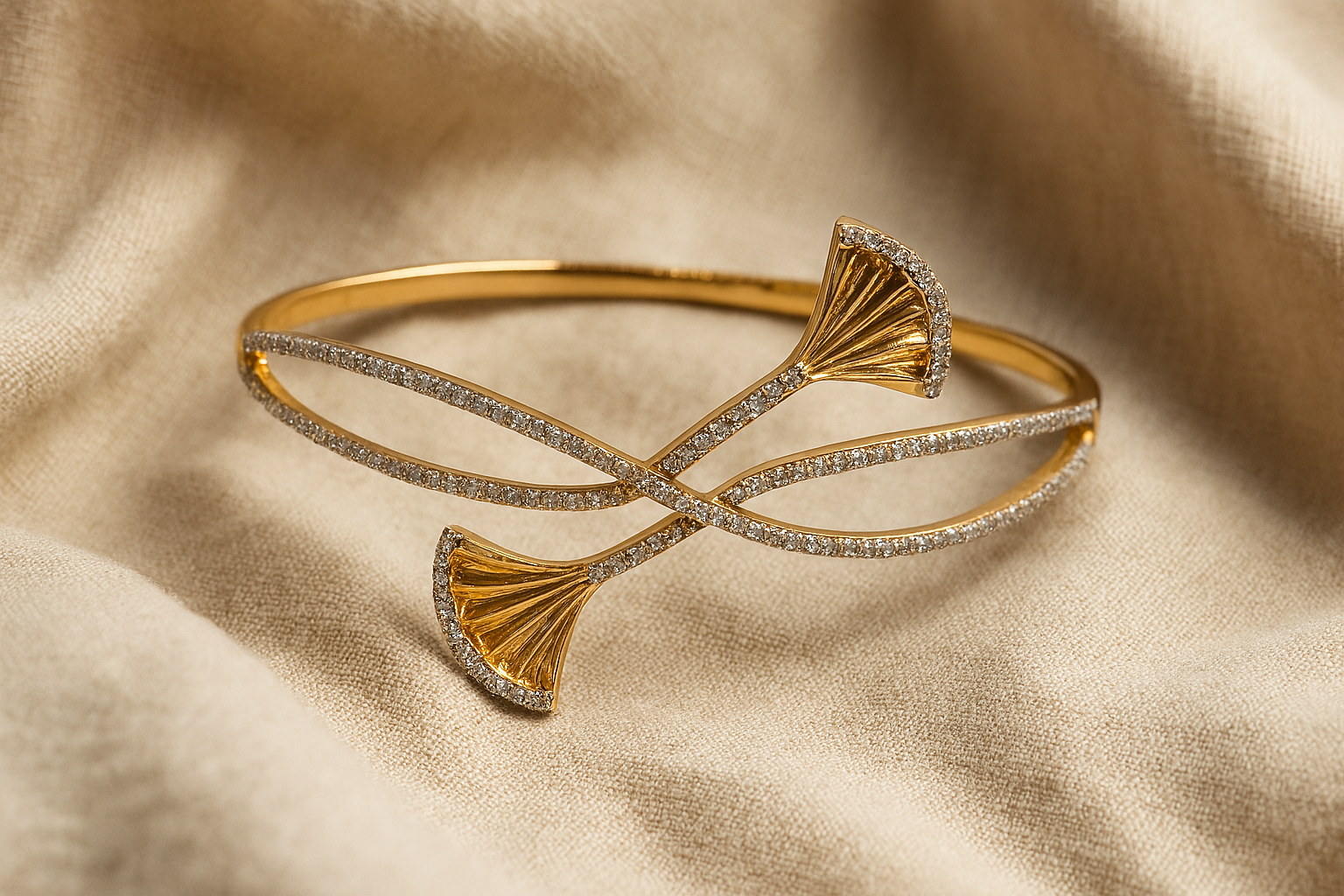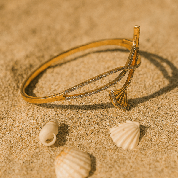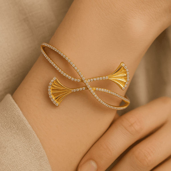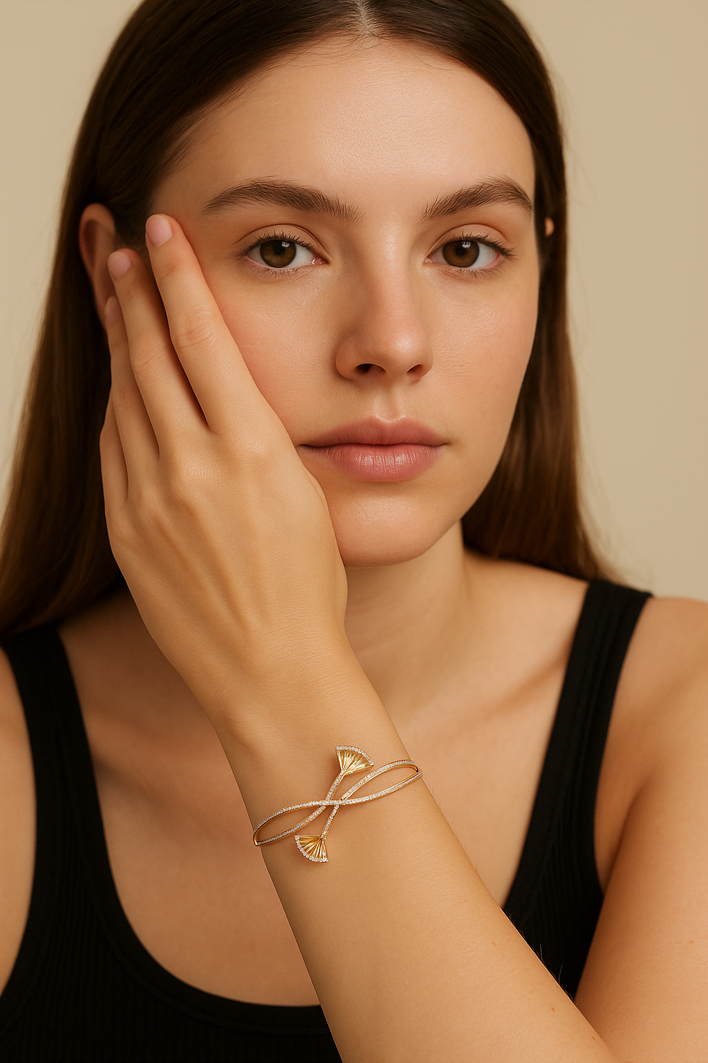 Elevate your style with this stunning 925 Sterling Silver Gold Vermeil Bangle, featuring a graceful open fan design adorned with sparkling White Cubic Zirconia stones. The intricate curves and high-polish gold vermeil finish create a luxurious look that’s both modern and timeless — perfect for special occasions or adding a touch of elegance to your everyday outfit.