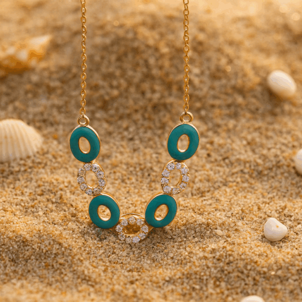 Featuring a series of oval links adorned with vibrant turquoise enamel and shimmering white cubic zirconia, this design strikes the perfect balance between bold and sophisticated. The high-polish gold-plated finish enhances the richness of the colors, making it a standout piece for both day and evening wear.