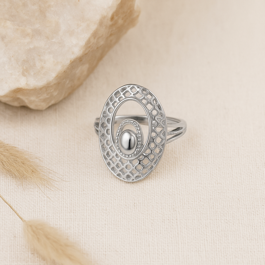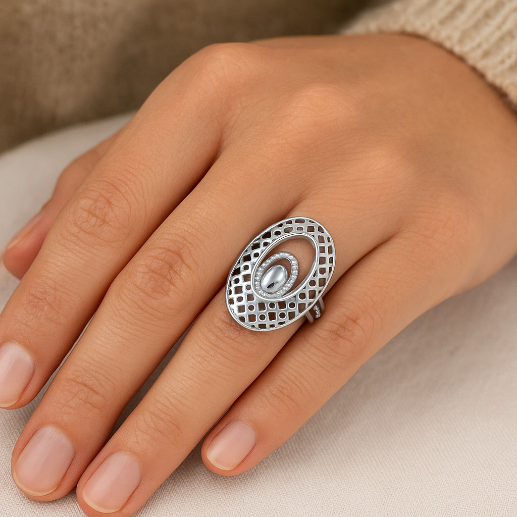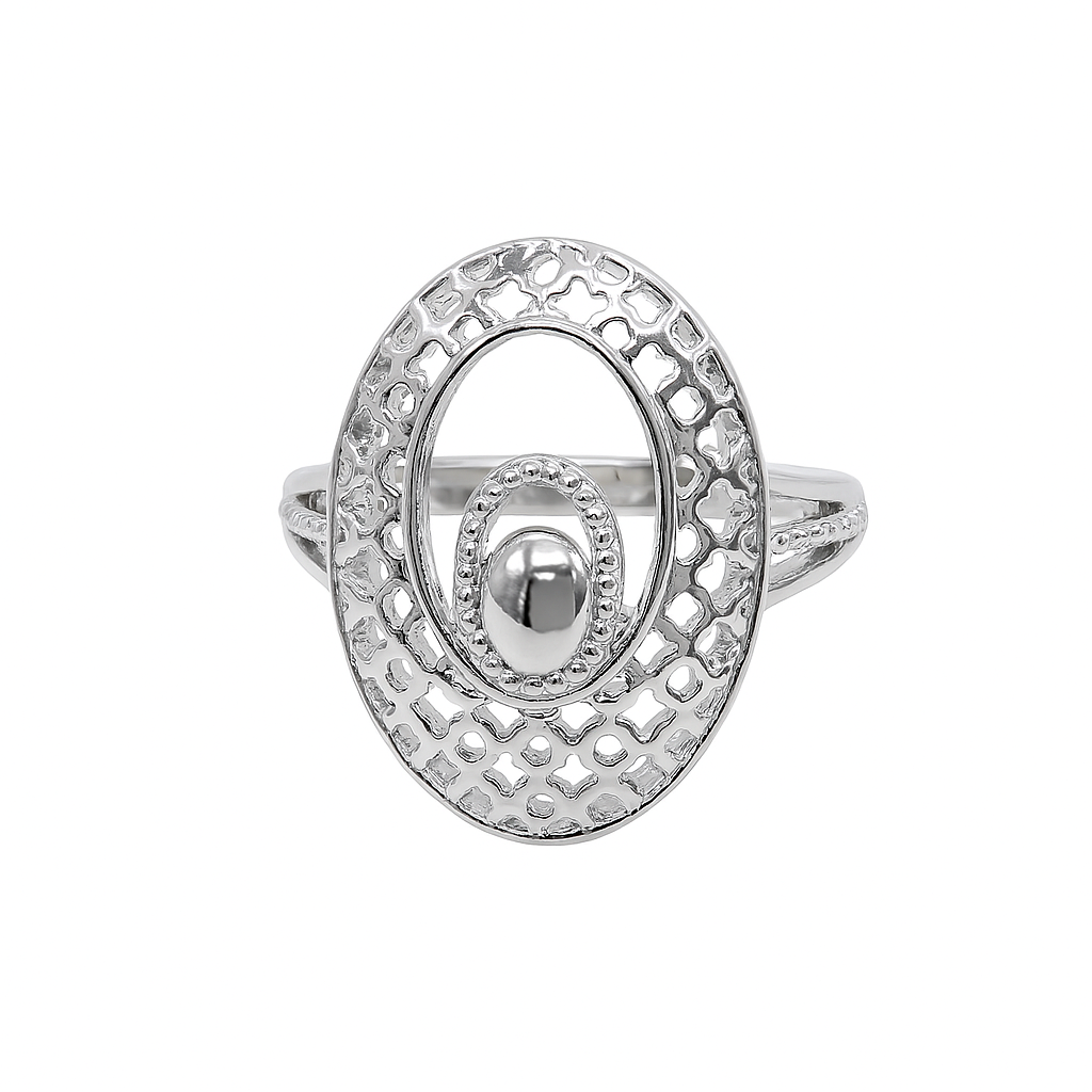 Featuring a unique open-work oval silhouette, the ring showcases a polished silver bead at the center, surrounded by intricate cut-out detailing that adds depth, dimension, and luxury. The smooth sterling-silver band ensures comfortable wear, making it perfect for daily styling, office wear, or minimal party looks.