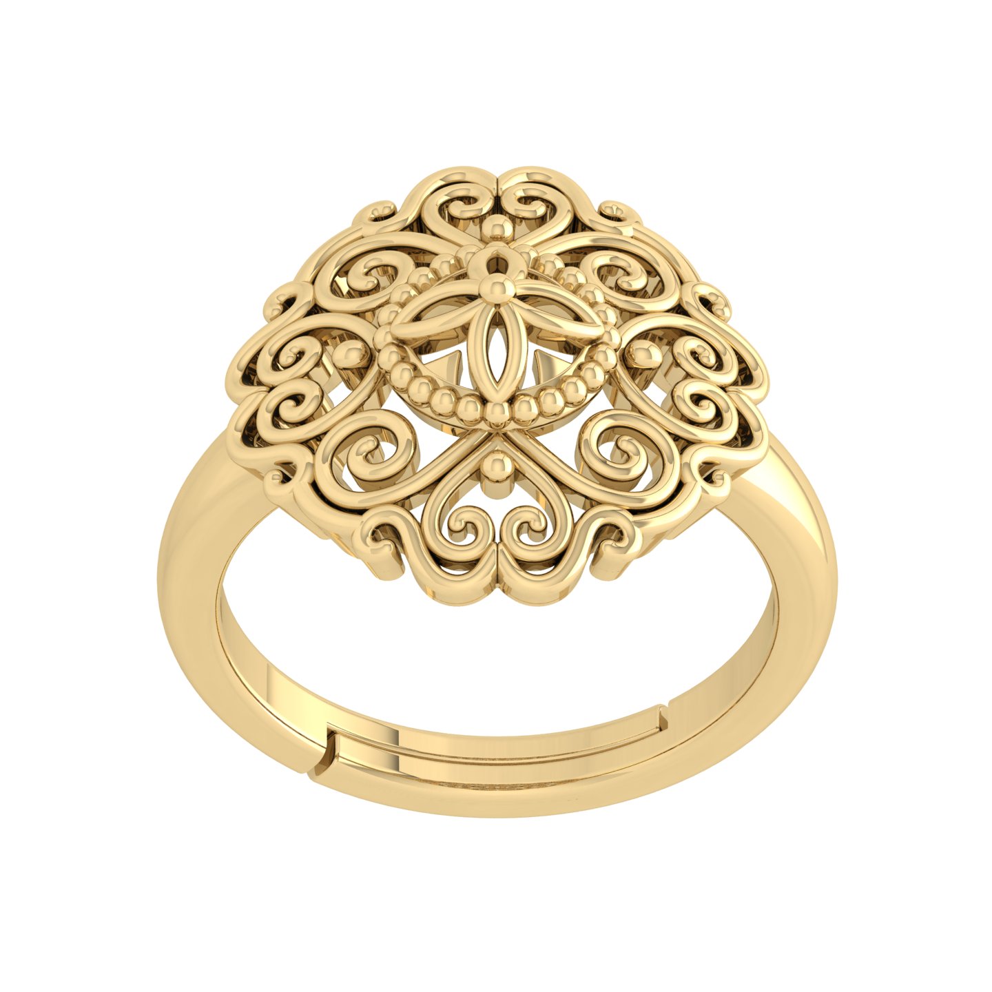 Elevate your everyday elegance with this exquisitely crafted 925 Sterling Silver adjustable ring, finished with a luxurious White Rhodium polish for long-lasting shine and tarnish resistance. The ring features an intricate floral motif, beautifully detailed with swirling filigree patterns and delicate bead accents that create a vintage–inspired charm.