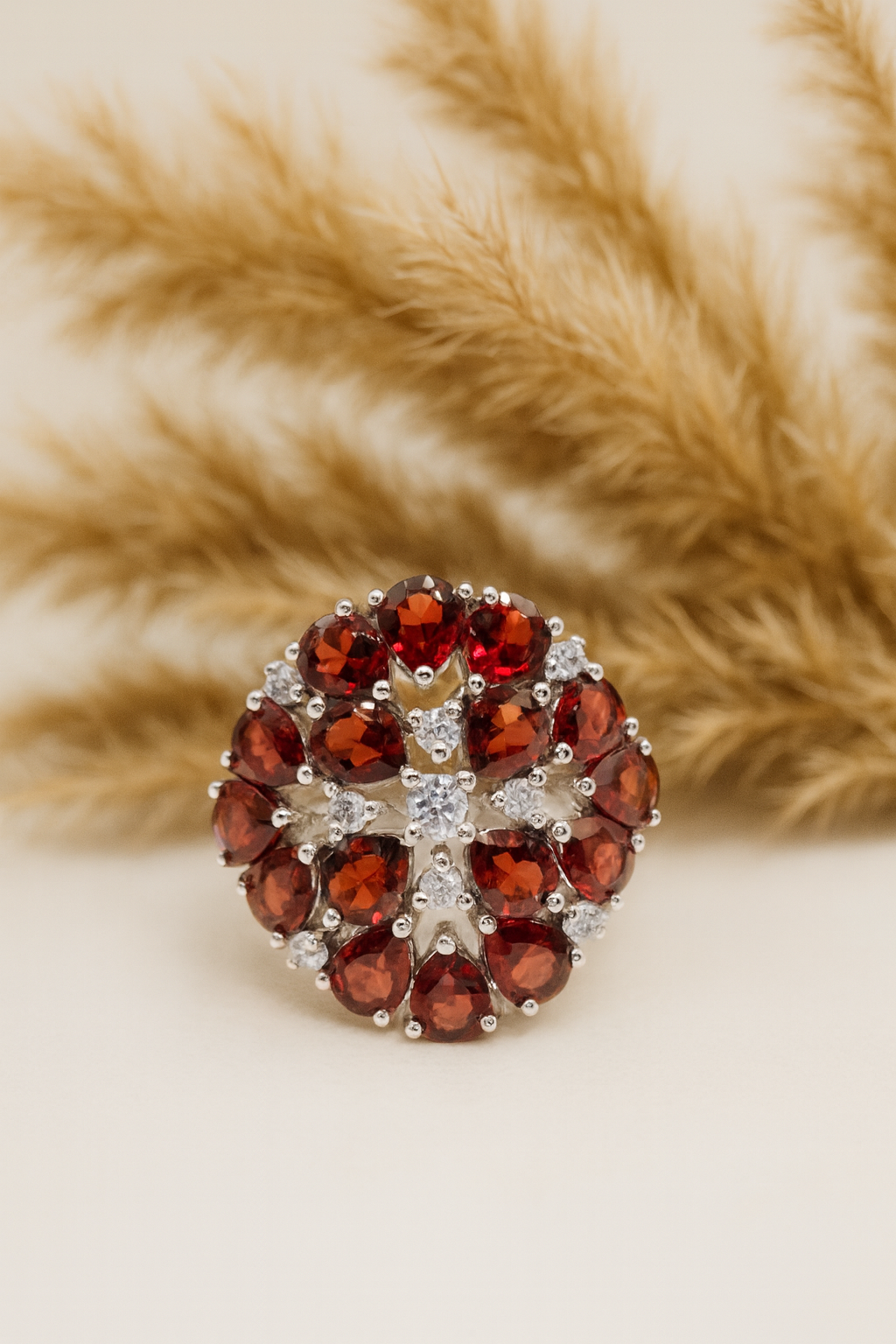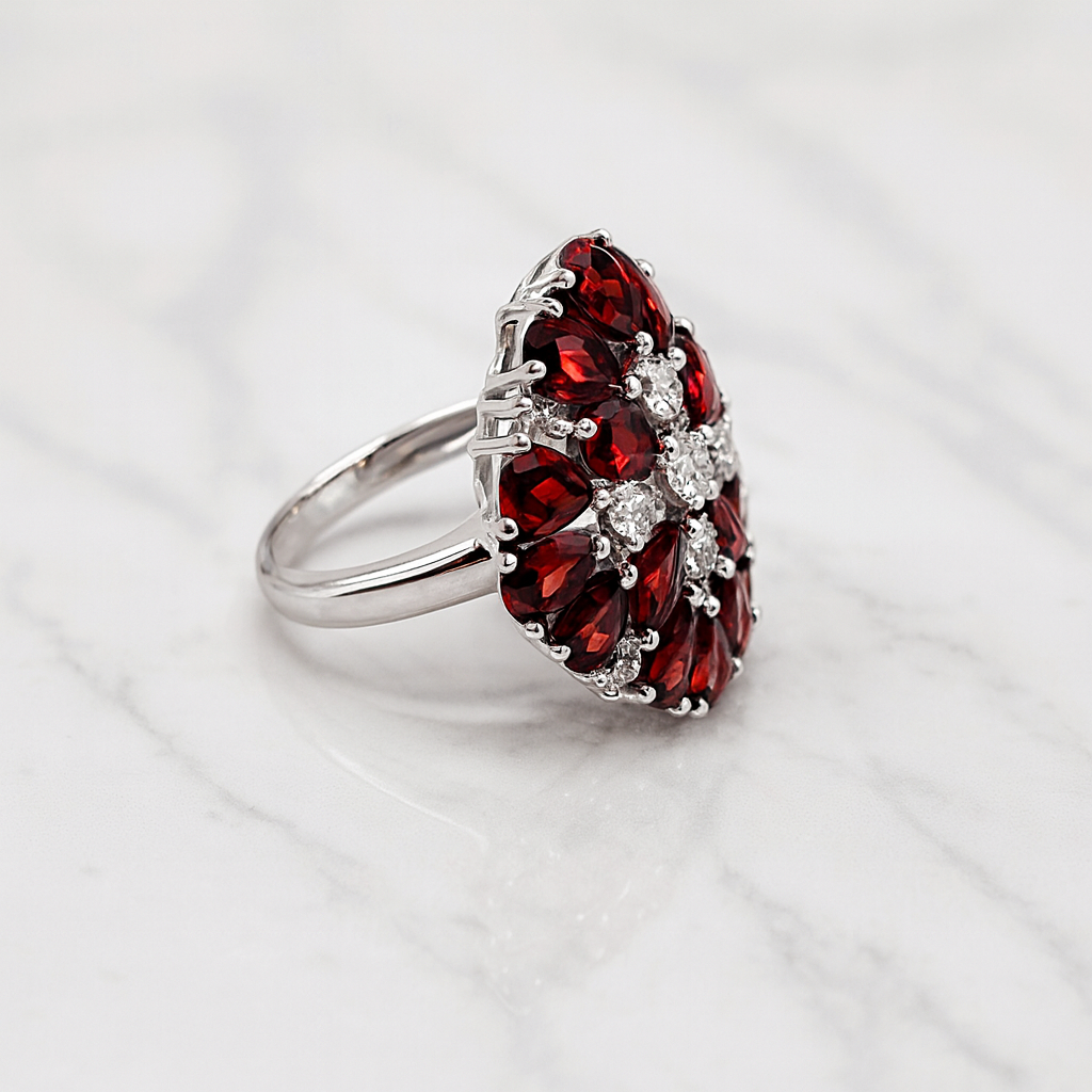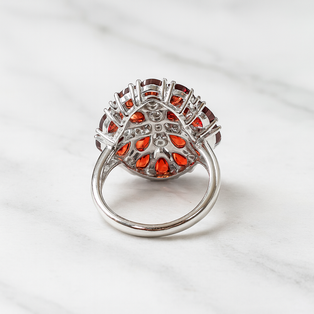 Make a statement with this bold vintage-inspired cocktail ring, featuring rich, wine-red natural garnet gemstones set in 925 sterling silver. The intricate clustered design is accented with sparkling white CZ stones, creating a dazzling floral burst effect that catches the light from every angle. Perfect for parties, evening wear, and special occasions, this eye-catching piece adds luxury and elegance to your look. A timeless treasure for gemstone lovers and those who adore standout statement jewelry.