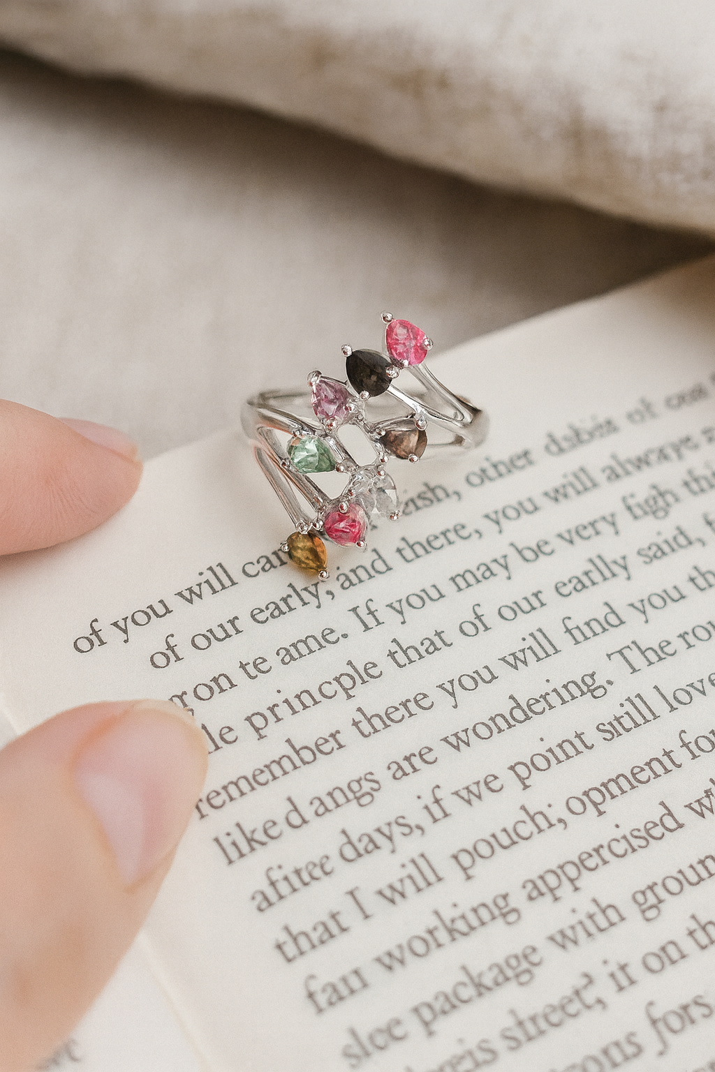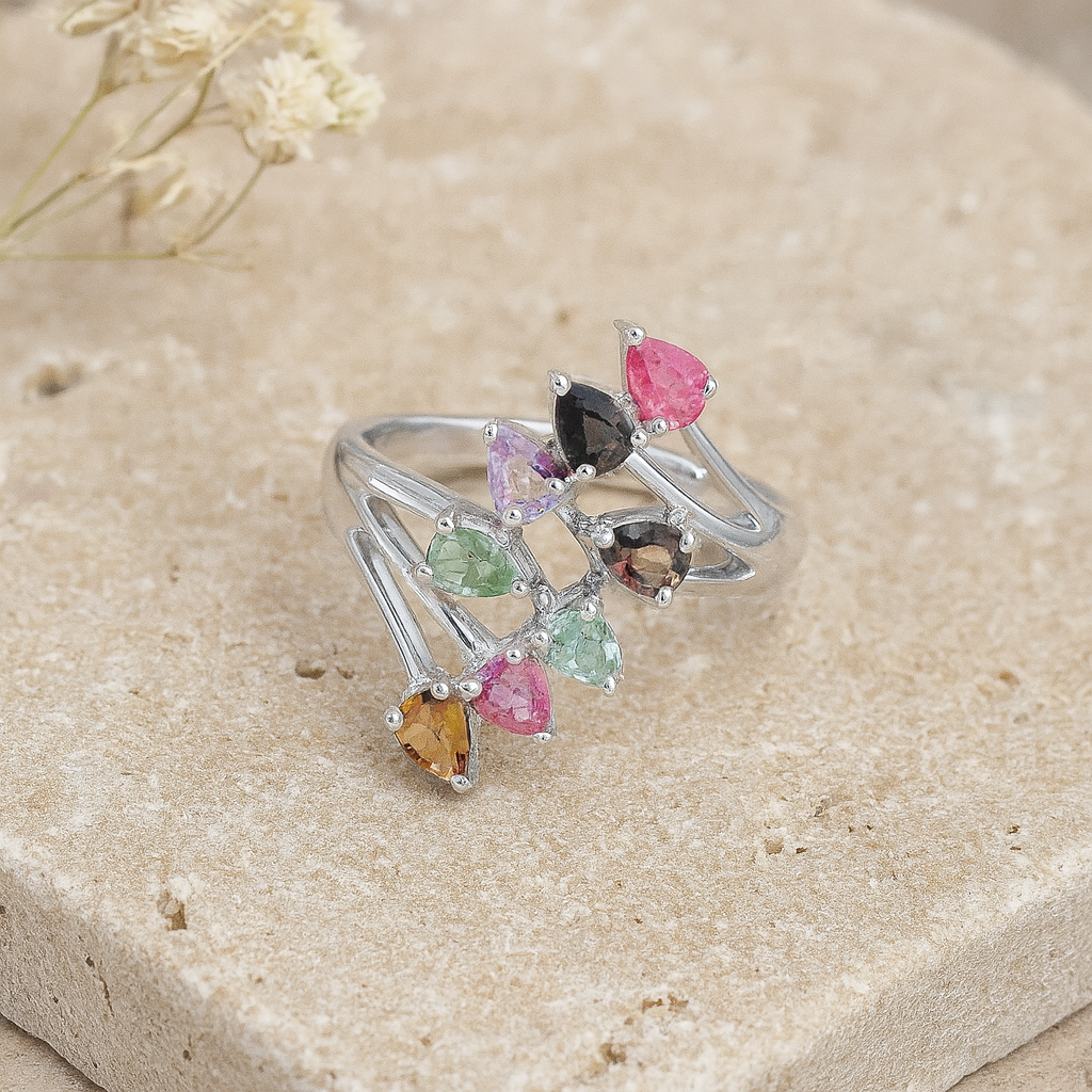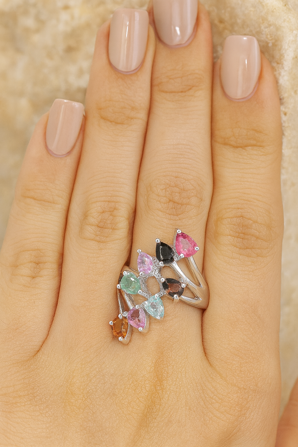 This ring is likely to have a beautiful array of vibrant colors due to the multi-tourmaline gemstones, which come in shades like pink, green, yellow, and blue. The high-polish finish on the sterling silver would give it a sleek, shiny appearance, while the relatively