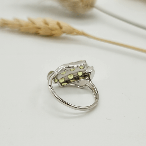 Make a bold and refreshing statement with this stunning 925 sterling silver ring, featuring a vibrant cluster of natural Peridot gemstones accented with sparkling white CZ. The lively green hue of the faceted Peridots adds a burst of colour and positivity, while the delicate white cz detailing along the shoulders brings elegant sparkle and refinement.